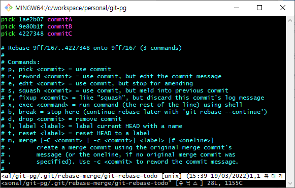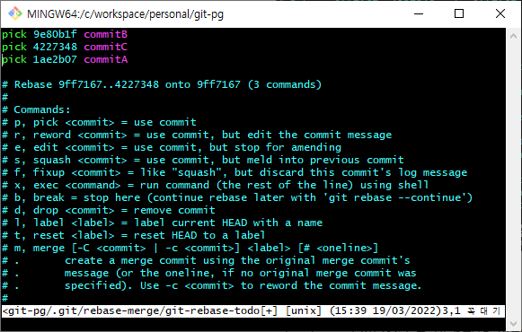 git rebase -i 9ff7167 를 입력하면 위처럼 커밋 순서가 나오게 된다.