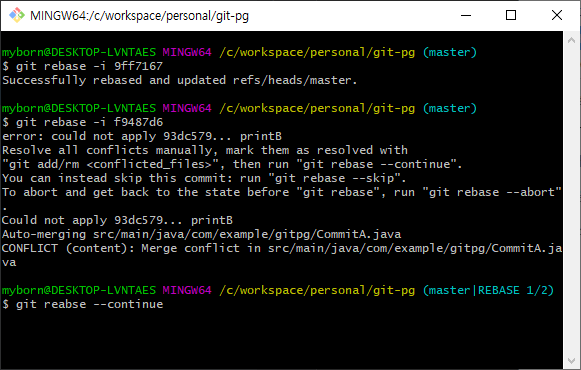 만약 충돌이 발생한다면 커밋별 충돌을 해결후 rebase를 계속 진행하면 된다.